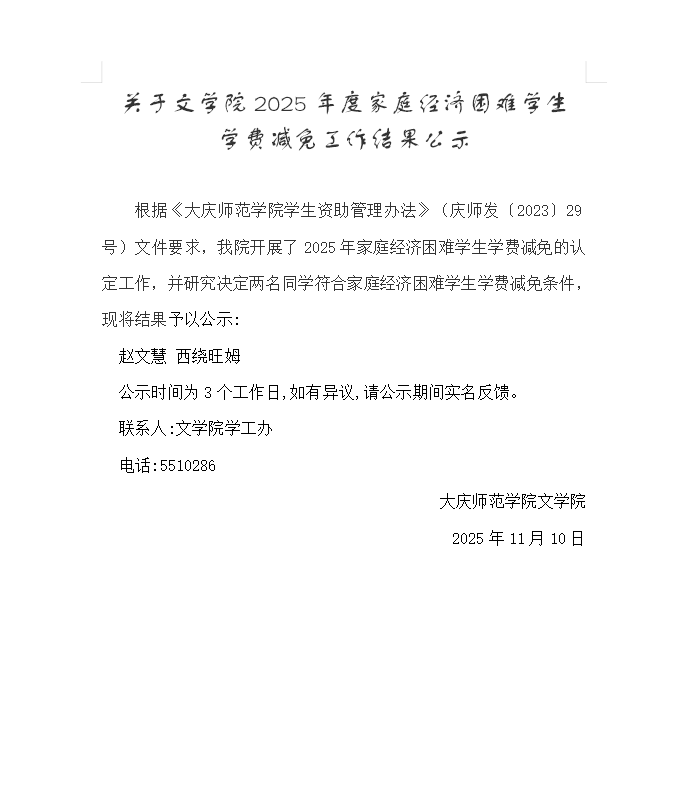 关于JINNIAN金年会2025年度家庭经济困难学生学费减免工作结果公示