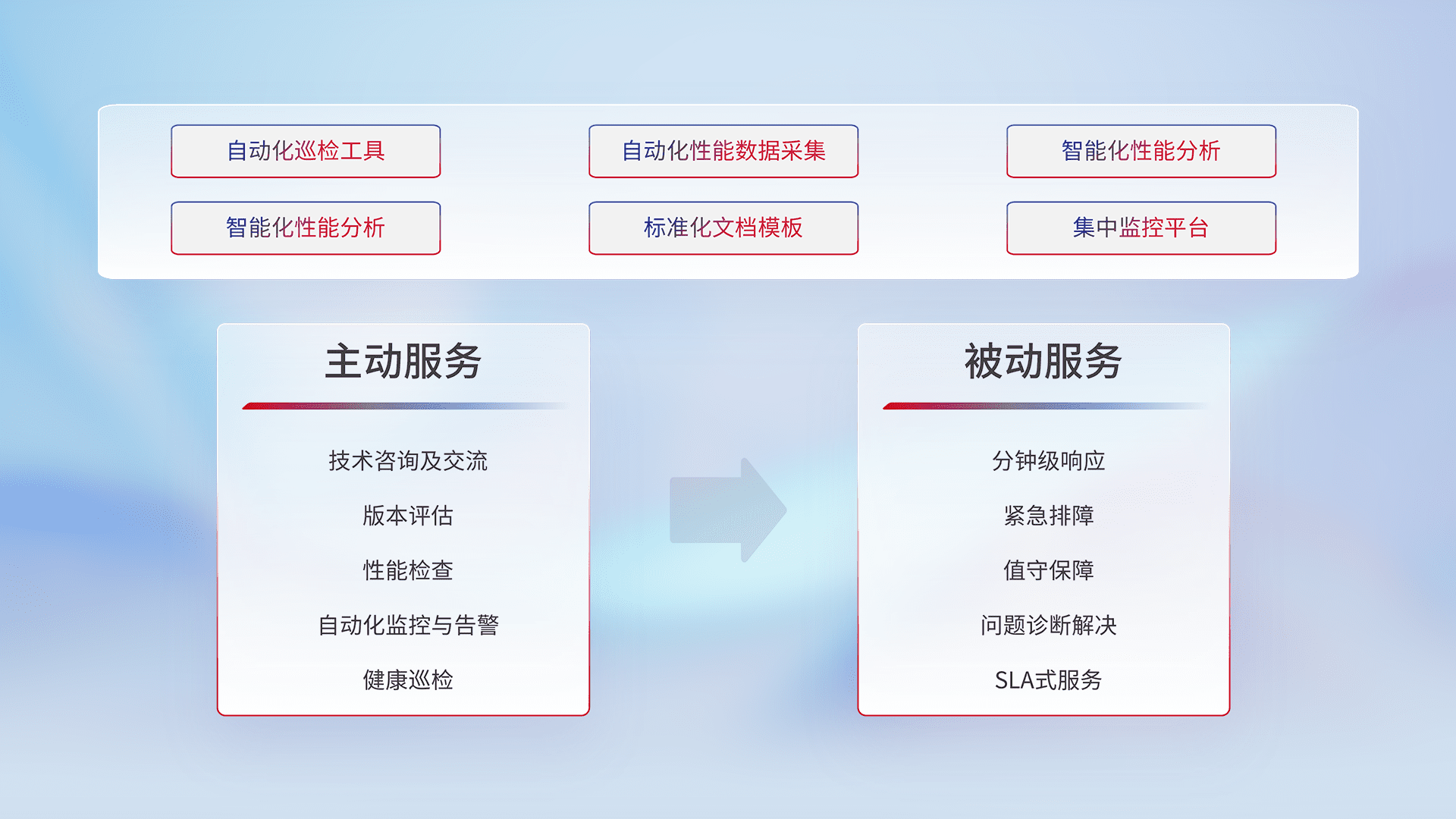 智能化工具和标准化文档,,,保障服务质量,,,提供主动服务(包含技术咨询、、、版本评估、、性能检查、、自动化监控与告警、、、、健康巡检)和被动服务包含(分钟级响应、、、紧急排障、、、值守保障、、问题诊断解决、、、SLA服务)。。。