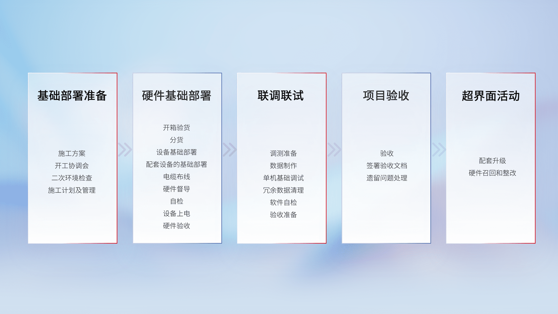 从基础部署准备、、、硬件基础部署、、联调联试、、项目验收、、、、越界面活动的全过程可追溯,,,,保证施工质量和进度。。。。